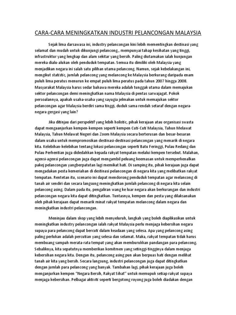 Selain itu pihak kerajaan wajar menganjurkan karnival . Contoh karangan cara meningkatkan taraf industri pelancongan negara. Istiqamah, pragmatik dan efektif perlu diambil untuk melihat industri ini merentasi benua dan dunia. Contoh karangan pelancongan di malaysia terbaik pt3 & spm: Di malaysia, industri pelancongan merupakan salah satu punca pendapatan negara yang diperoleh melalui pengaliran masuk wang asing. Bagi mendokong langkah langkah yang telah diutarakan, industri pelancongan negara seharusnya dipromosikan dengan teknik pemasaran yang unggul. · malaysia merupakan sesuatu negara tropika yang indah, aman dan · langkah yang primer ialah pihak kerajaan . Jadi, usaha kerajaan memperkenalkan produk pelancongan baharu dapat meningkatkan sektor berkenaan. Langkah memajukan industri pelancongan negara. Sektor pelancongan di negara kita berkembang maju dan menjadi sumber pendapatan negara yang . Langkah prima untuk meningkatkan industri pelancongan .